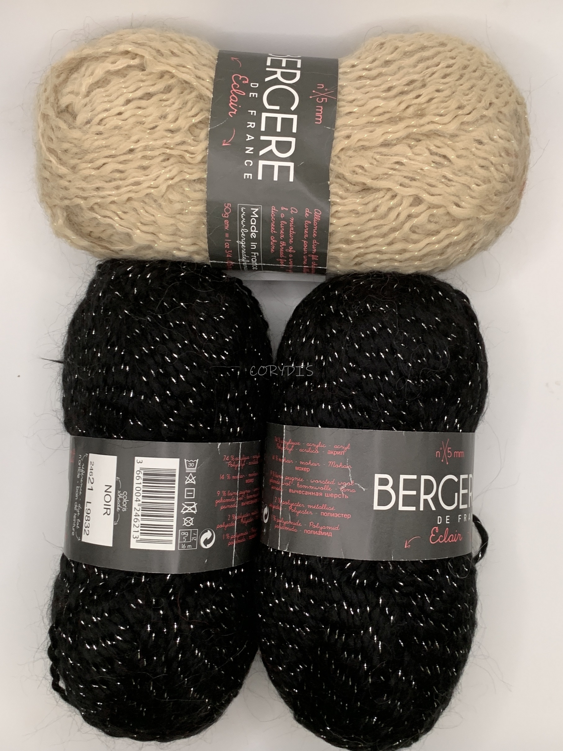 ECLAIR de Bergère de France. Pelote 50gr, env.105m. 74% acrylique, 14% mohair, 9% laine peignée, 3% lurex. Aiguilles 4,5/5. Echantillon 10x10cm =15mx21rgs.