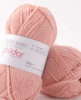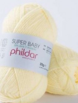 Laine Super Baby de Phildar, 70% acrylique, 30% laine d’agneau. Pelote 25gr, env. 107m.