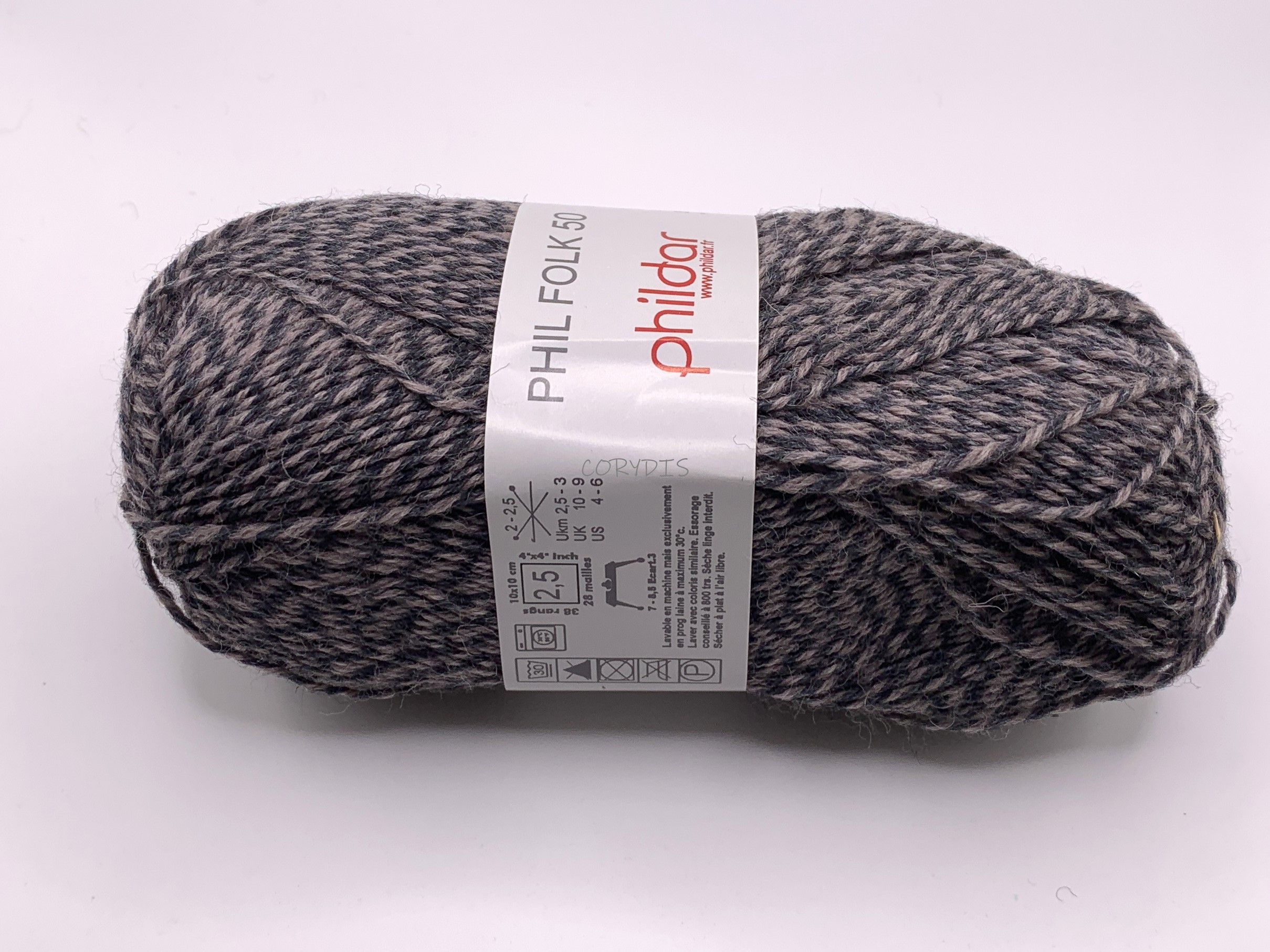 Laine PHIL FOLK 50 de Phildar. Pelote 50gr, env. 210m. 75% laine, 25% polyamide. Aiguilles n°2/2.5. Echantillon 10x10cm=28mx38rgs.