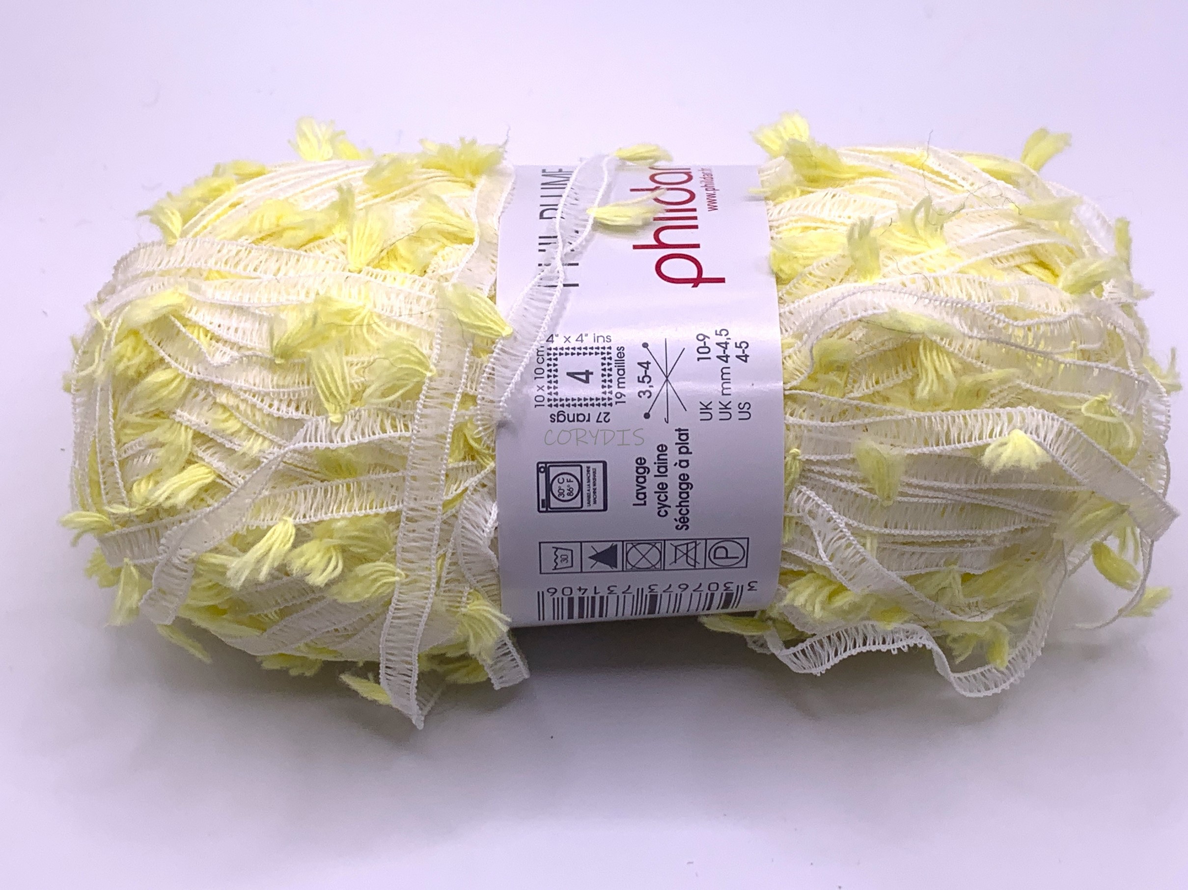 PHIL PLUME de Phildar. Pelote 50gr, env. 110m. 75% polyamide, 25% coton. Aiguilles 3,5/4. Echantillon 10x10cm=19mx27rgs.